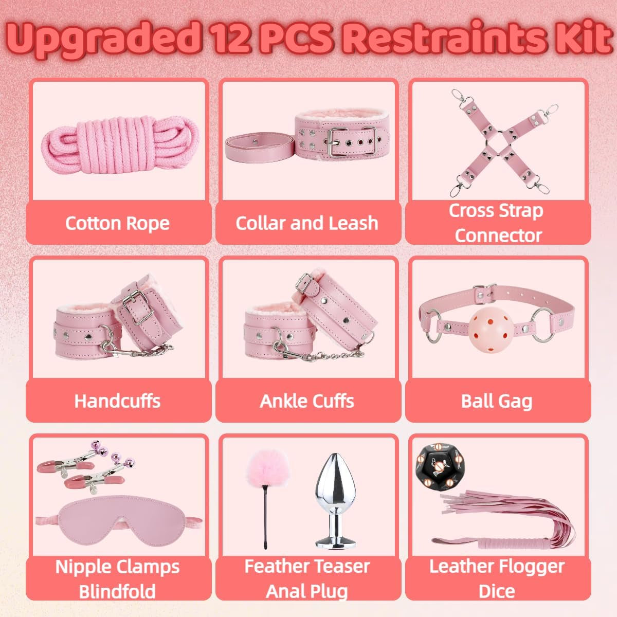 INITIATION features premium leather-style restraints, sensory tools, and intimate accessories, all coordinated in an elegant pink finish. From soft handcuffs and ankle cuffs to blindfolds, nipple clamps, and a ball gag, each piece is designed with beginners in mind—offering gentle introduction to intense sensations while maintaining comfort and safety.